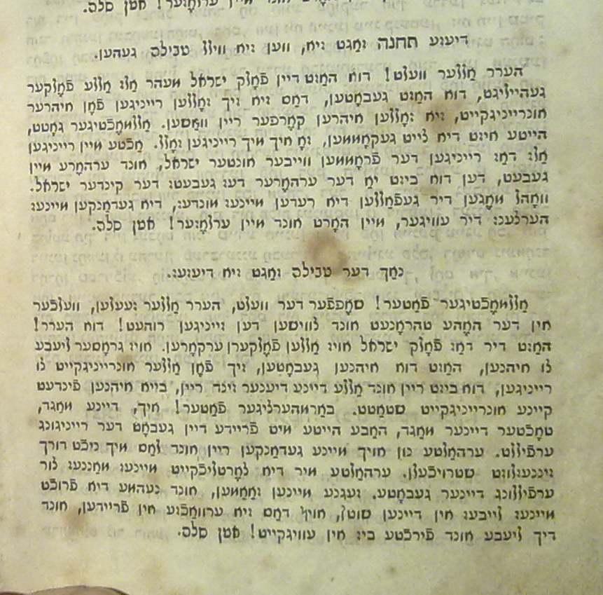 Anbei der Text der Rödelheim-Techinót. Sie wurden in Hochdeutsch verfasst, aber mit hebräischen Buchstaben geschrieben. Dazu wurde wie üblich eine besondere Schriftwart verwendet. Die Sprache wirkt ein bisschen gewohnungsbedürftig, aber ich möchte weder die Grammatik noch die Rechtschreibung verbessern. Eher möchte ich dem Leser ermöglichen, die Sprache des Originals zu spüren.