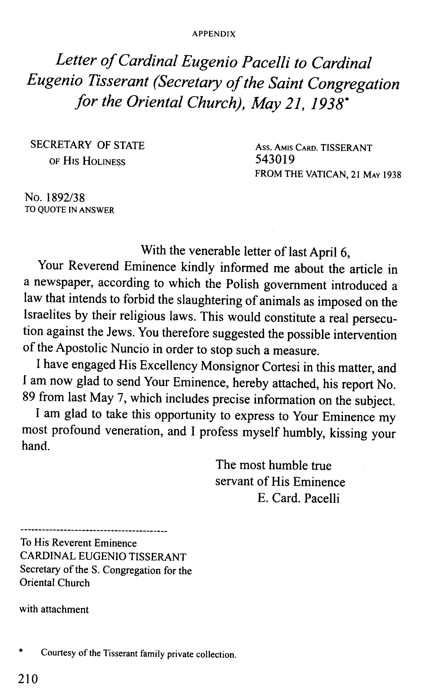 This is a courageous and praiseworthy move, and it is not the first time that the Catholic Church has interceded on behalf of Jews’ right to practice shechita. As the letter below, which appears in the book Pius XII and the Jews, shows, when the Polish government in 1938 considered banning shechita, the then Secretary of State of the Vatican Cardinal Eugenio Pacelli undertook to lobby the Polish government to drop the proposed ban.