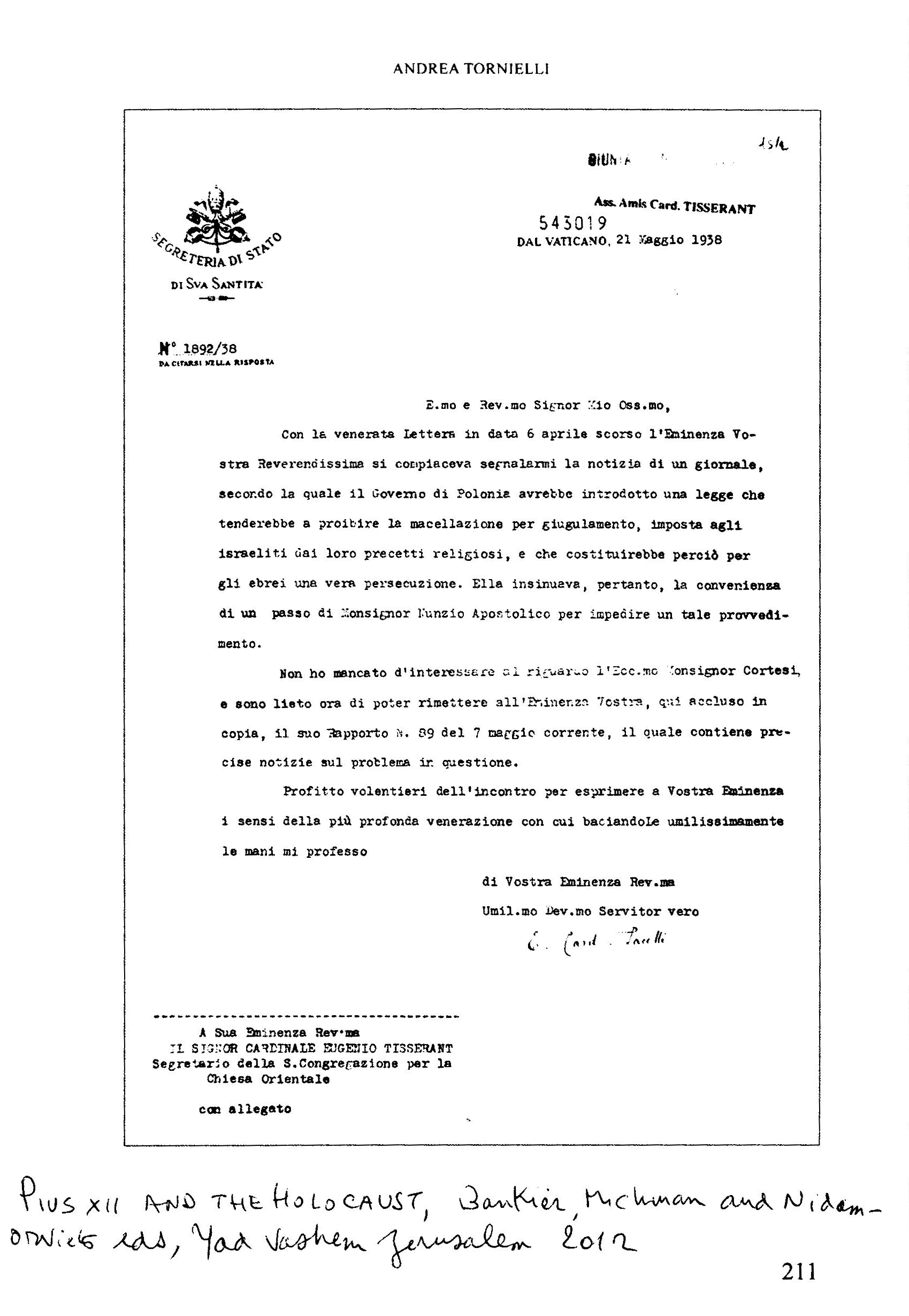 The original letter, in Latin, is found at the end of this post. Its English translation below is from Pius XII and the Jews. I thank Rabbi Dr. Riccardo Di Seigni, the Chief Rabbi of Rome, for bringing this letter to my attention.