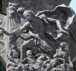 Detail der Knesset Menora von Benno Elkan, der die Wiederbelebung der trockenen Gebeinen abbildet
