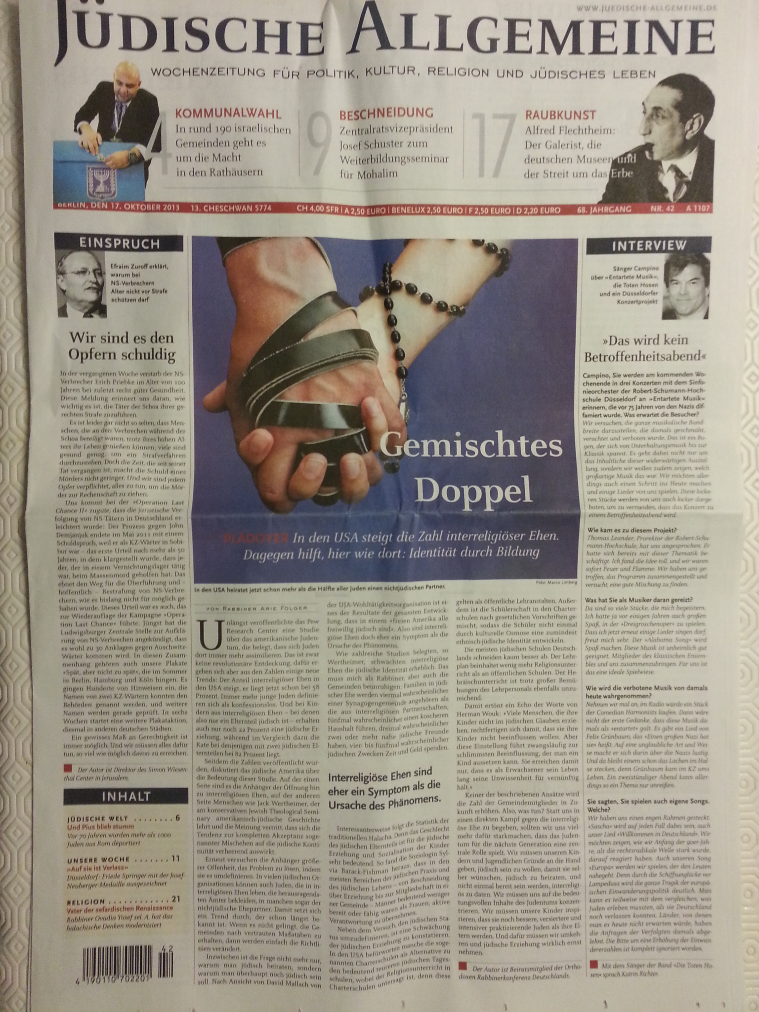 … and it’s not on a WANTED poster (though it’s not a postage stamp, either), the abbreviated German version of my article on the recent Pew survey of American Jews was featured on the front page of the Jüdische Allgemeine. Thank you Editor in Chief Mr. Kauschke.